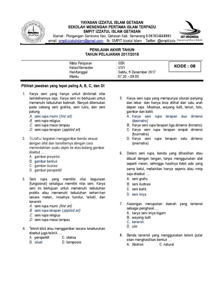Seni rupa yang bertujuan untuk memenuhi kepuasan fisik (seni pakai) dan psikologis(seni . Hasil karya seni kriya pada zaman prasejarah pada umumnya digunakan untuk. Soal berisi pilihan ganda disertai kunci jawaban dan juga soal essay / uraian. Seni lukis adalah salah satu karya seni rupa yang berdimensi… Berikut, soal essay sbk kelas xi .
